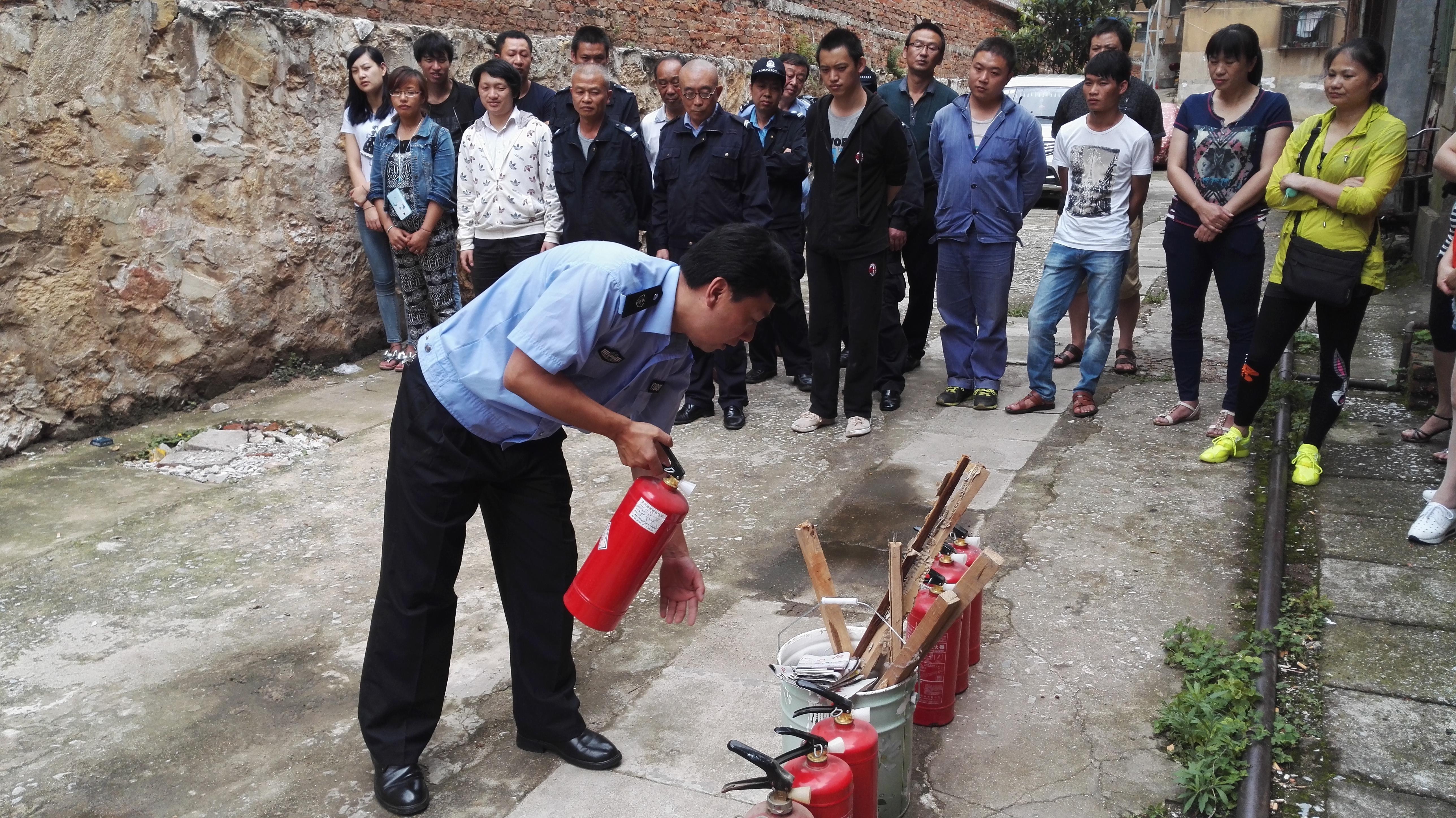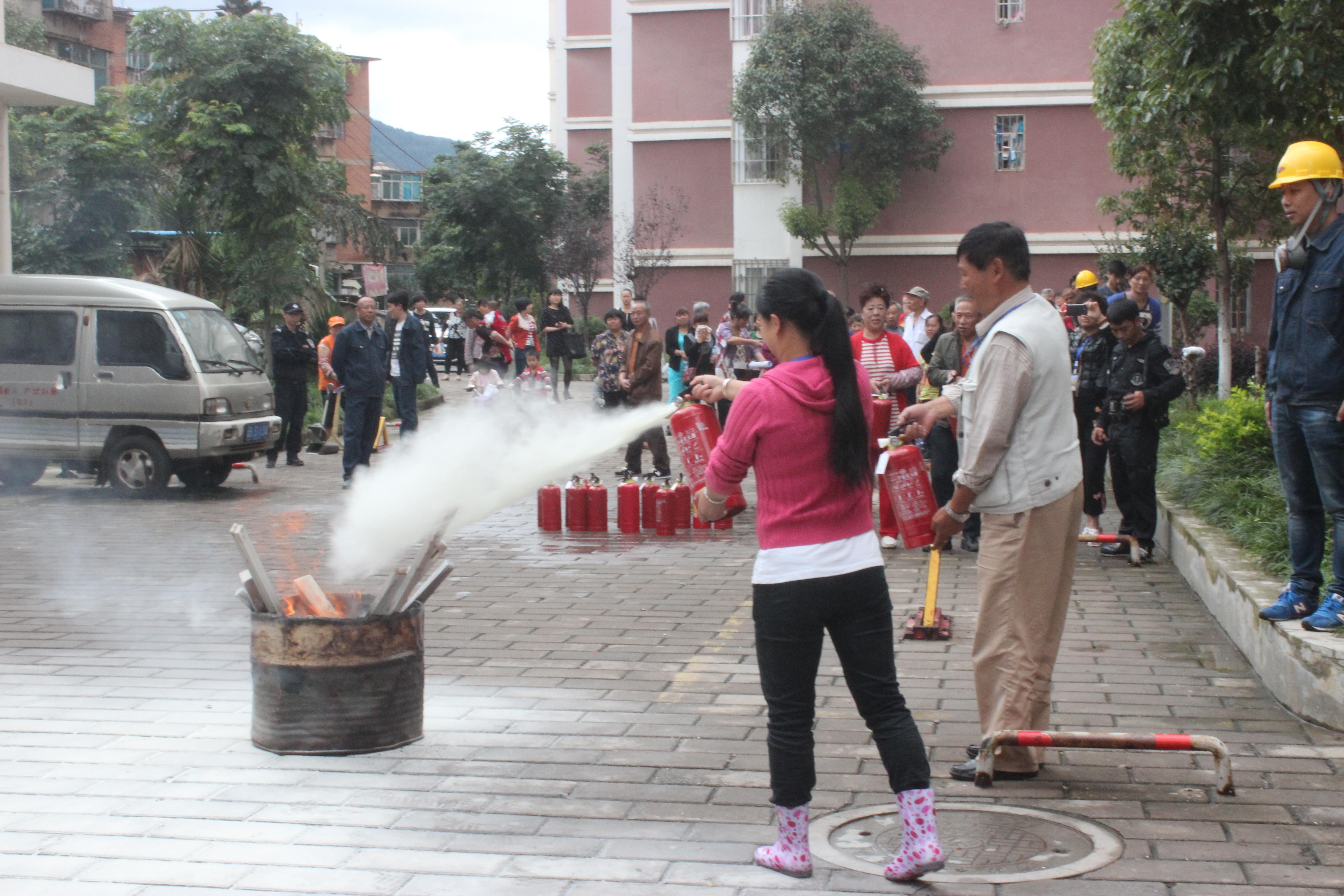 演练现场,广元物管保卫队队长郜震华作培训指导。他就灭火器的使用、初期火灾扑救、火险隐患、应急自救常识等方面向在场人员进行了详细讲解。随后,在机关小区85幢楼前的空地上,进行了干粉灭火器灭火演练。活动中,各小区人员通过轮流操作,熟练掌握了灭火器的使用方法。