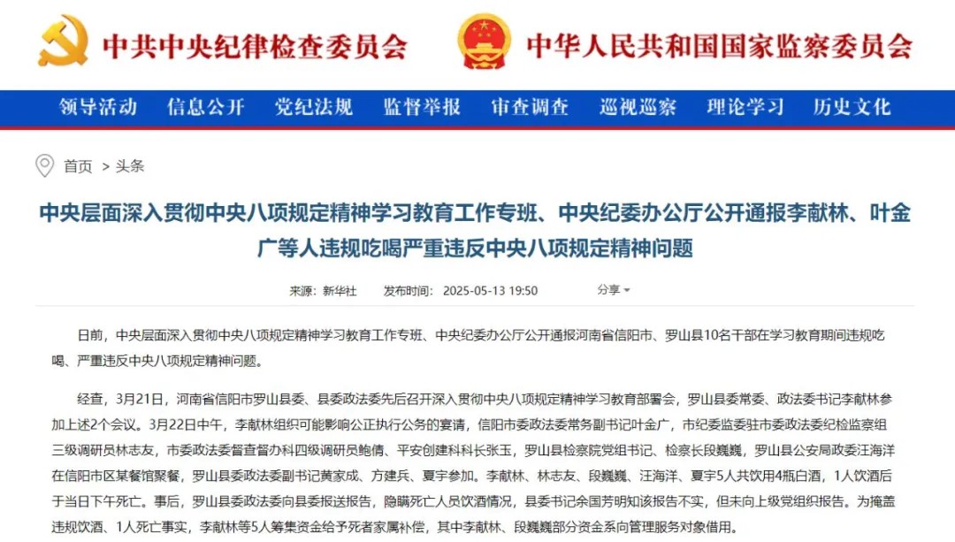 近日,中央层面深入贯彻中央八项规定精神学习教育工作专班、中央纪委办公厅公开通报河南省信阳市、罗山县10名干部在学习教育期间违规吃喝、严重违反中央八项规定精神问题。