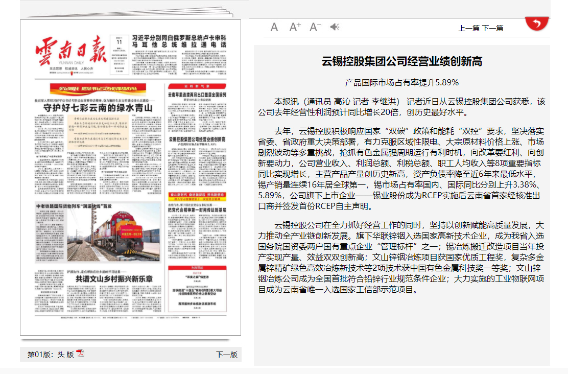 1月11日,云南日报头版刊发《云锡控股公司经营业绩创新高 产品国际市场占有率提升5.89%》。