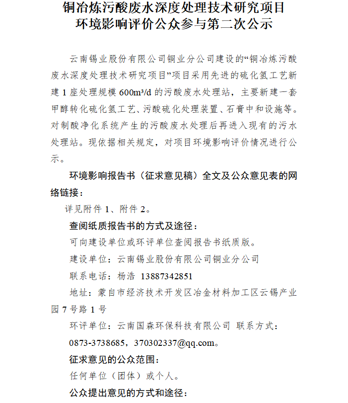 铜冶炼污酸废水深度处理技术研究项目环境影响评价公众参与第二次公示