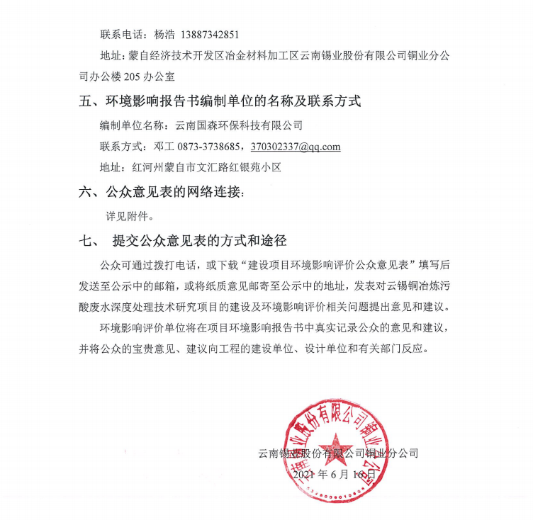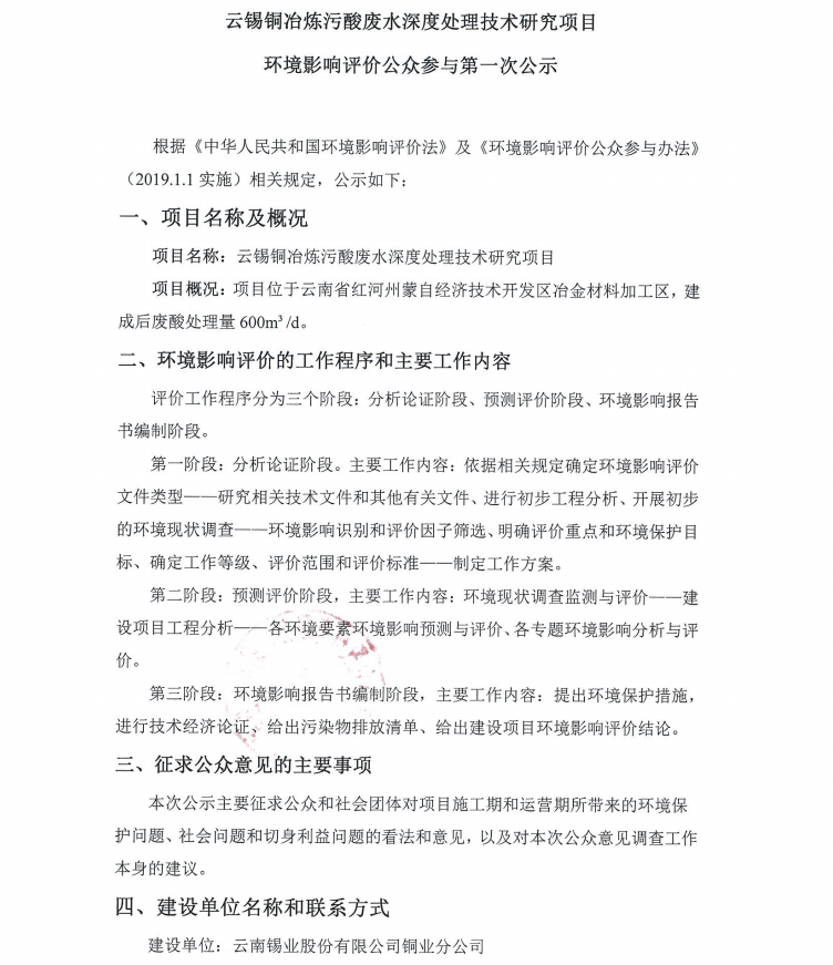 云锡铜冶炼污酸废水深度处理技术研究项目环境影响评价公众参与第一次公示