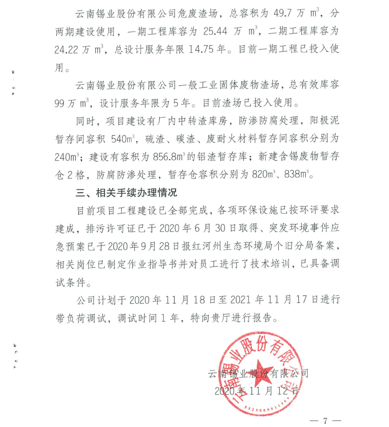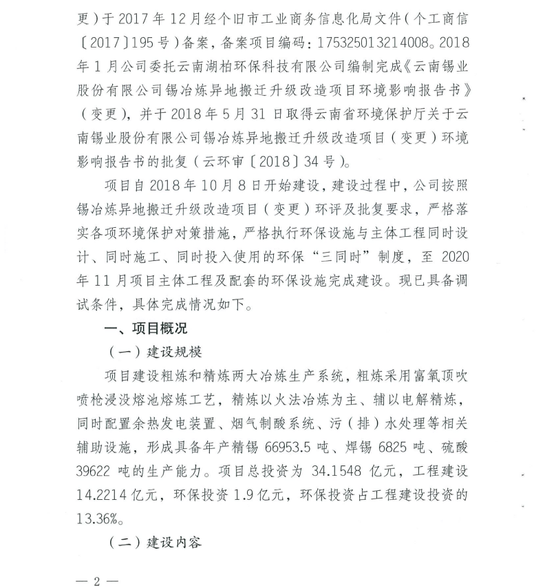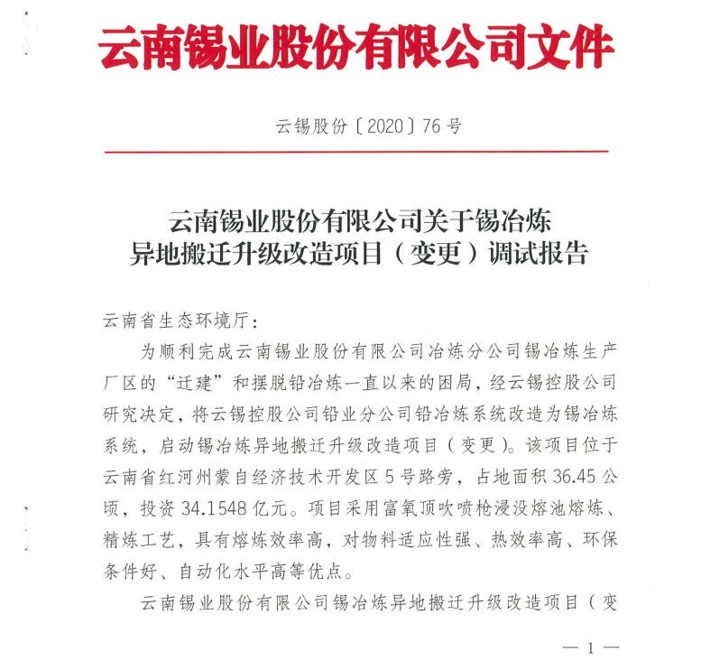 云南锡业股份有限公司关于锡冶炼异地搬迁升级改造项目(变更)调试报告的公示