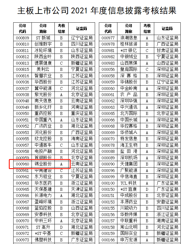 7月4日,深圳证券交易所发布了《2021年度上市公司信息披露考核结果》,锡业股份(000960)考核评价结果为最高等级A级,自2017年之后再次回到信息披露考核最高等级阵营。从考核结果统计来看,深市上市的2,553家公司中考核结果为A(优秀)的公司家数仅为454家,占参加考核上市公司总数的17.78%。其中,云南辖区考核结果为A的深市上市公司仅有5家。