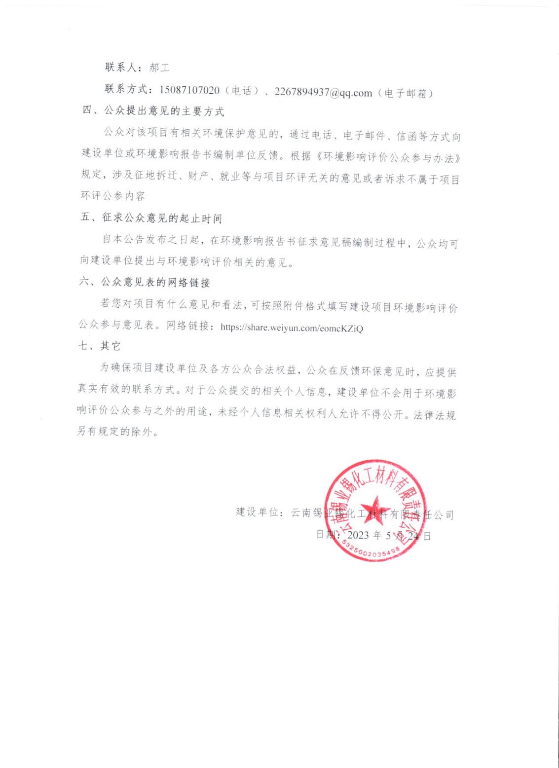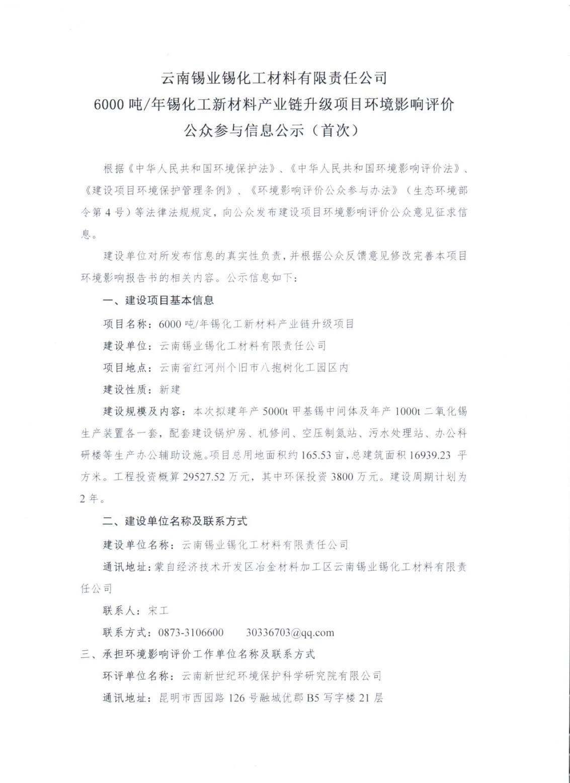 云南锡业锡化工材料有限责任公司6000吨/年锡化工新材料产业链升级项目环境影响评价公众参与信息公示(首次)