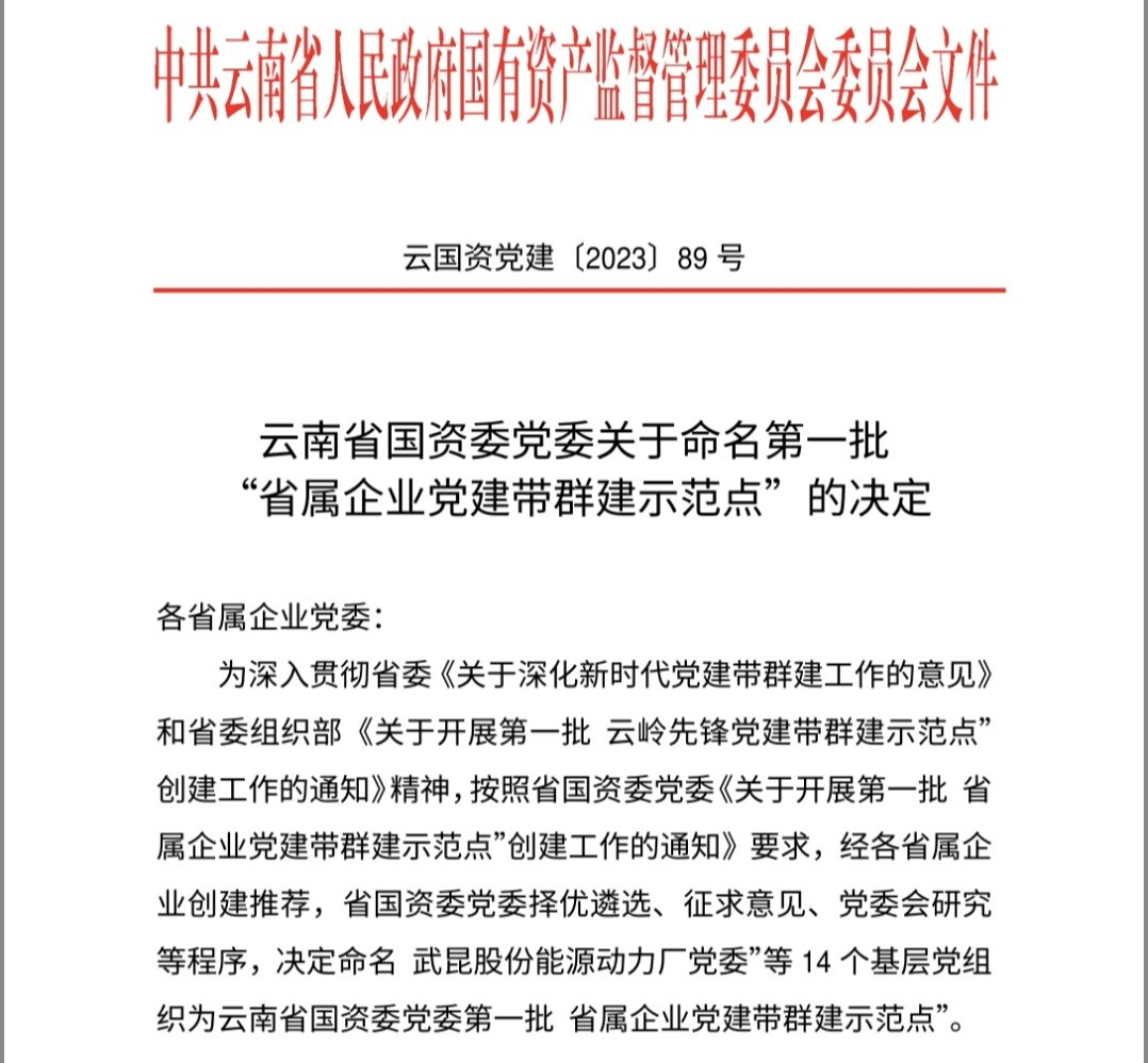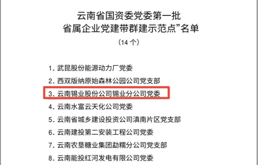 近日,云南省国资委党委办公室发布了《云南省国资委党委关于命名第一批“省属企业党建带群建示范点”的决定》,云锡锡业分公司党委成功入选云南省国资委党委第一批“省属企业党建带群建示范点”名单。