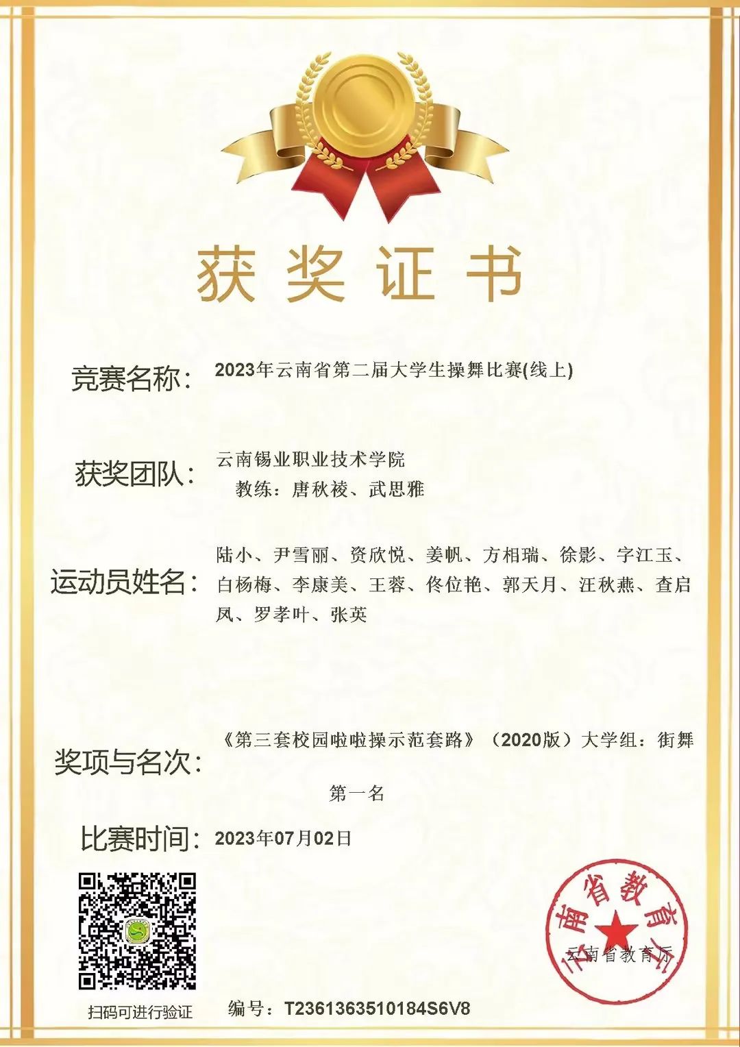 “台上一分钟,台下十年功”,骄人的成绩背后凝聚了师生辛勤的汗水。她们早晚练、周末练,是梦想、是团队的力量支撑着不断努力和坚持下去。经过激烈角逐,《第三套校园啦啦操示范套路》大学组街舞获得了第一名,《2019年版健美操大众锻炼标准》一级、《第三套校园啦啦操示范套路》大学组花球、《2018年普及版民族健身操》、自编校园啦啦操四个项目获得第二名,2018年广场舞推广套路《点赞新时代》获得第四名,自编广场舞、《2020版全国大学生街舞推广套路》Hiphop两个项目获得第六名。