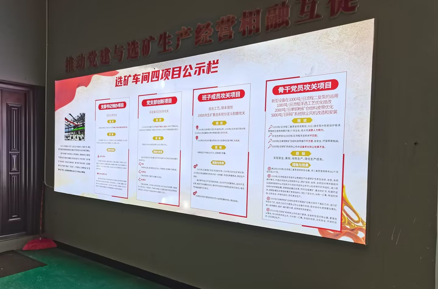 党员活动阵地建设上建立“1+2+N”(1个具备功能完善、全面展现支部工作和特色的党员活动室;2个党支部四项目工作展示、党员风采展示;N个“学思想、强党性、重实践、建新功”总要求、控股公司“1334”发展思路、“3815”战略发展目标、选矿车间党建品牌LOGO及名称等党建氛围营造)的阵地矩阵,凸显选矿车间党建与品牌、党员与生产的特色和亮点,让党的要求与基层实际相融合、让党建工作与生产经营相融合,使党员活动阵地不仅仅是党员们日常学习活动的主要场所,更是党员们的“充电站”和“精神家园”,为有力提升全体党员队伍的凝聚力和向心力提供了一个良好的环境。