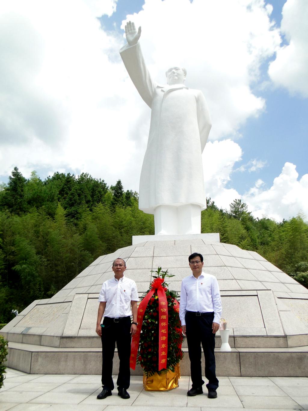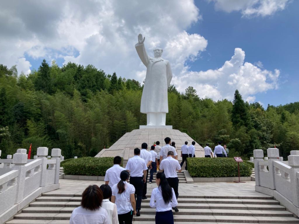 沿着151级台阶,大家缓步拾级而上,在毛泽东雕像前肃立致敬,并敬献花篮、整理缎带,三鞠躬后,一起深情瞻仰毛泽东雕像。
