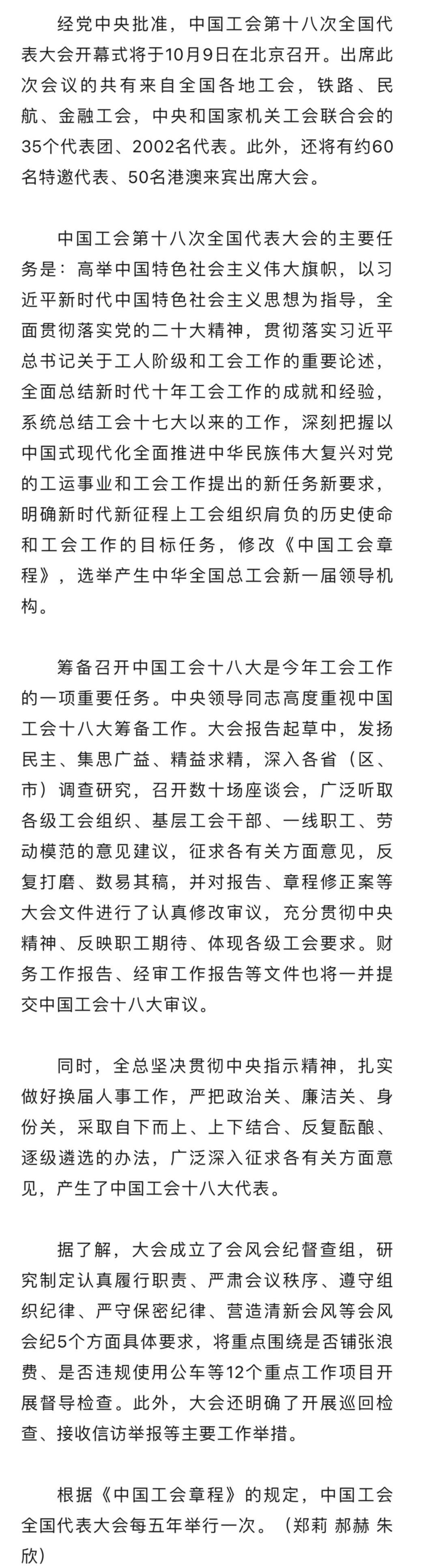 中国工会十八大将于10月9日在北京开幕
