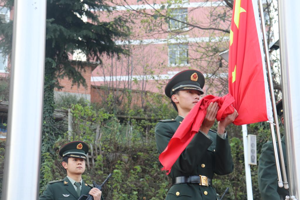 上午8点,师生们怀着崇高的敬意肃然而立,学院国防后备连国旗护卫队昂首挺胸、步履铿锵,在激昂雄壮的《义勇军进行曲》中,鲜艳的五星红旗冉冉升起、迎风飘扬,全体师生行注目礼,表达对祖国崇高的敬意和无限的热爱。