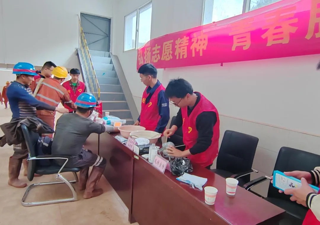 大屯锡矿开展“弘扬志愿精神 青春服务矿山”主题活动,在上下班的时间节点为工人师傅们进行血压测量、帮助他们清洁口罩、安全帽、提供暖心热饮,发放反诈宣传资料、宿舍卫生清扫、清洗电瓶车等志愿服务。(杨潇贤)