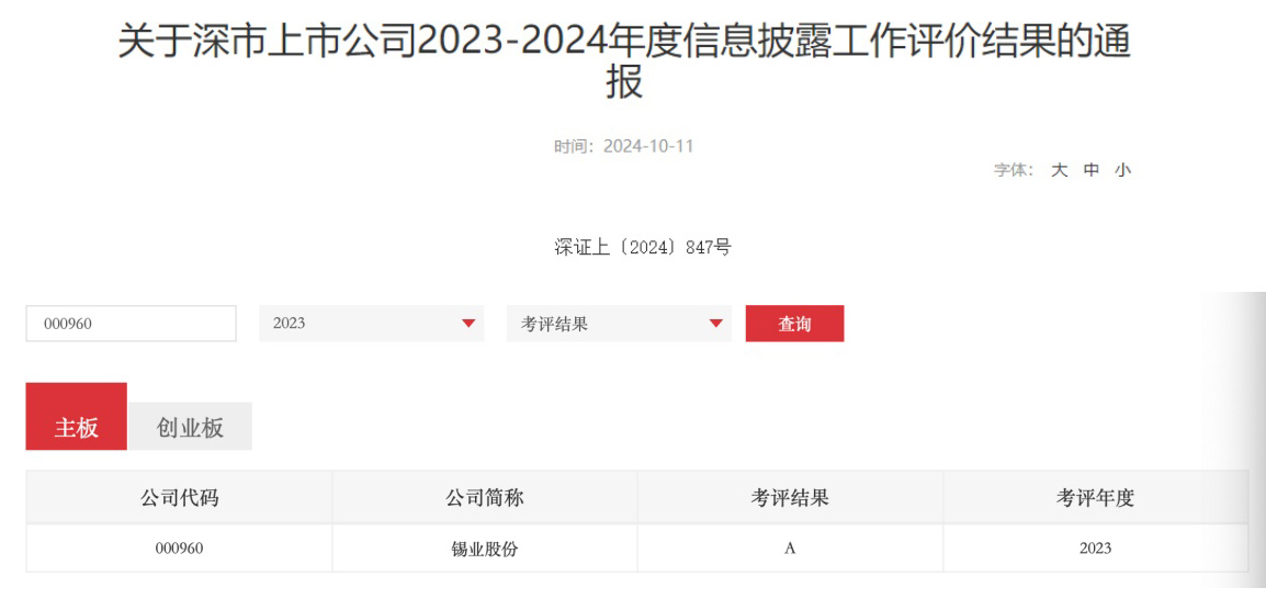 10月11日,深圳证券交易所发布《关于深市上市公司2023-2024年度信息披露工作评价结果的通报》,锡业股份(000960)考核评价结果为最高等级A级。从评价结果统计来看,深市上市的2810家公司中,评价结果为A(优秀)的公司仅为487家,占参加评价上市公司总数的17.33%。其中,云南辖区评价结果为A的深市上市公司仅有6家。