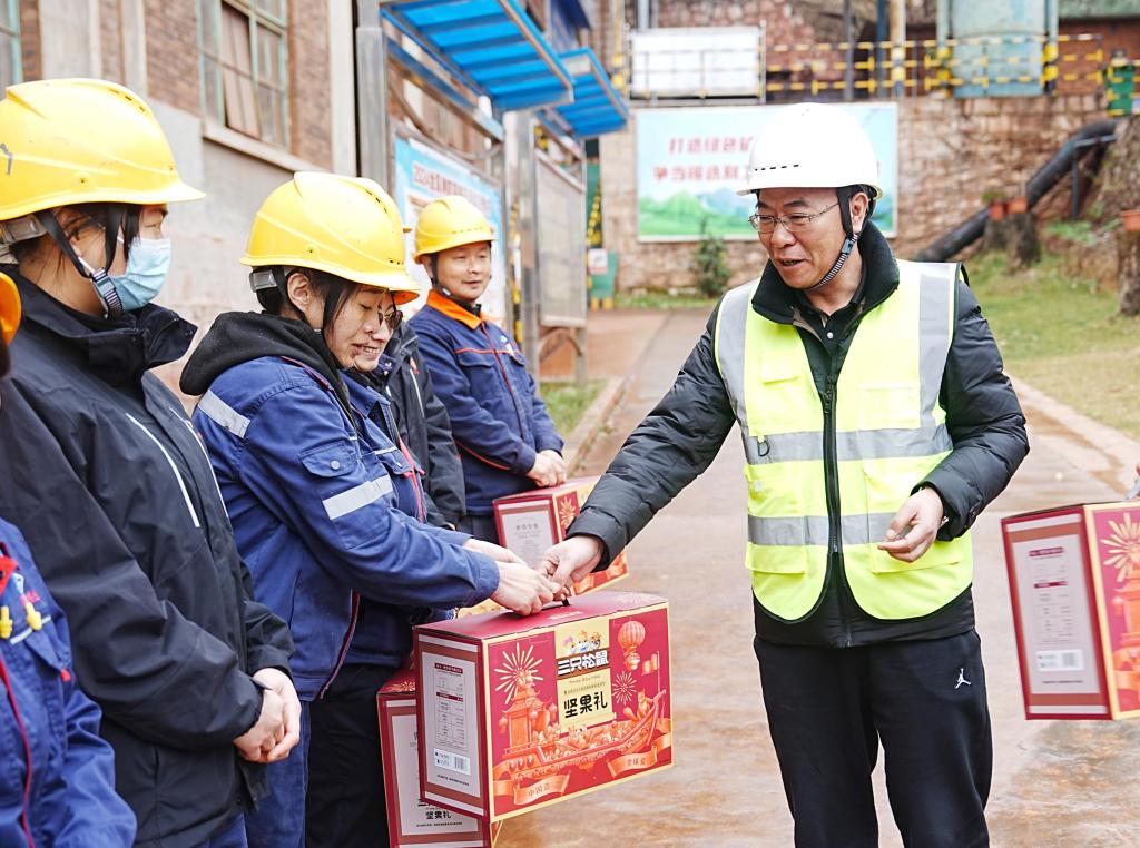 在大屯锡矿选矿车间氧化矿工段,孙勇与当班职工一一握手、亲切交谈,感谢大家一年来的辛勤付出和默默奉献,勉励大家要切实保证安全、高效、稳定生产,以实干实绩为百年云锡再创新辉煌作出新贡献。