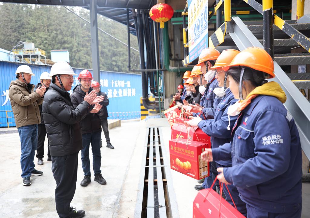 在卡房分公司选矿车间5000吨流程排班房、2000吨尾选工段,孙勇与大家亲切握手交谈,感谢大家的辛勤付出和努力并致以新年问候。希望大家做好节日期间安全生产各项工作,在新的一年里立足岗位、继续奋斗,争取创造新的佳绩。(李瑶 张瑞华)