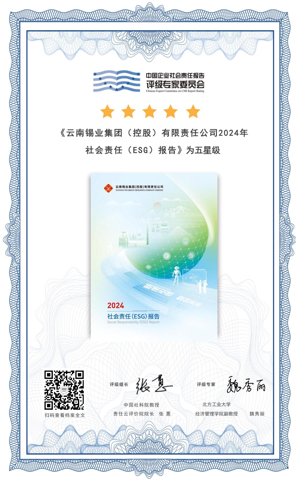 近日,经中国企业社会责任报告评级专家委员会评定,《云南锡业集团(控股)有限责任公司2024年社会责任(ESG)报告》获评“五星级”,被评价为“是一份卓越的企业可持续发展报告”。这是云锡连续两年斩获“五星级”权威评级,体现了业界对云锡长期坚持可持续发展、积极传递责任价值的充分认可与肯定,进一步提升了公司在ESG领域的品牌形象。