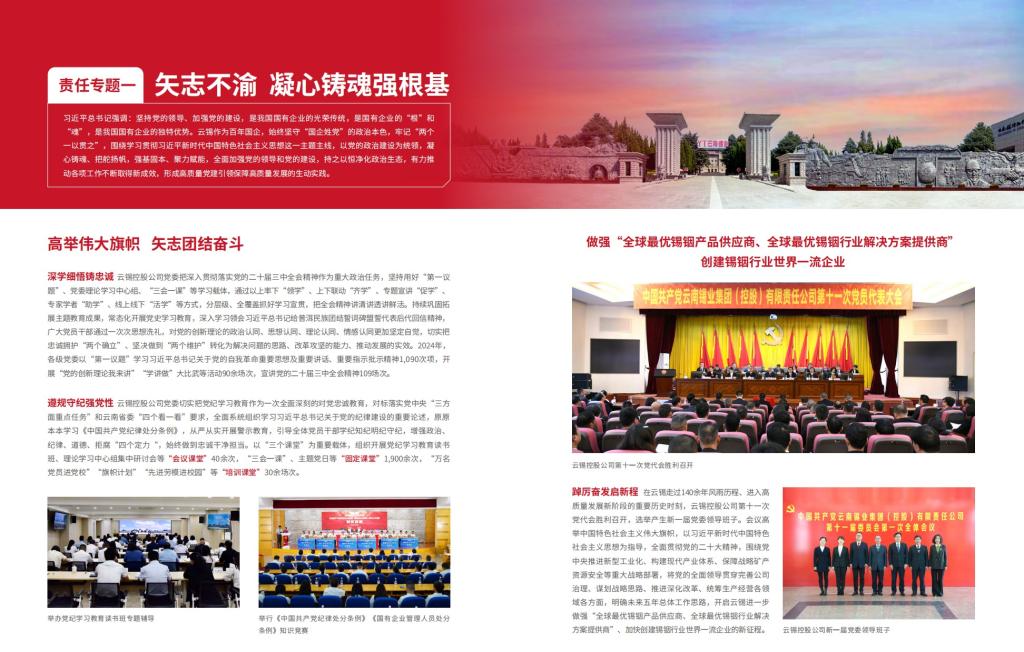 《报告》设置“矢志不渝 凝心铸魂强根基”“勇攀高峰 向新向智向未来”两大责任专题,贯穿深入学习贯彻习近平新时代中国特色社会主义思想和党的二十大精神主线,聚焦“做强两个全球最优、创建锡铟行业世界一流”和“打造具有核心竞争力的创新高地”两条轴线,生动展现云锡在全面加强党的领导、以高质量党建引领高质量发展、推动科技自立自强等方面取得的突出成效。