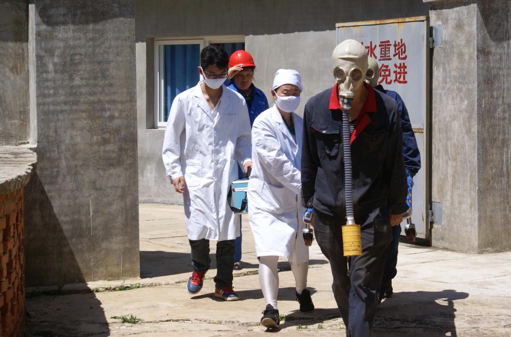演练严格按《二氧化氯、盐酸泄漏应急处置演练方案》要求进行,演练先后模拟厂区净化站二氧化氯发生室二氧化氯泄漏,值班人员中毒倒地和盐酸罐破裂,盐酸泄漏至安全围堰内,安全围堰周围有大量酸雾,值班人员在开安全围堰排污阀途中被盐酸酸雾呛伤,面部、眼睛有轻度酌伤。调度室值班人员接到报告后立即向运营管理部部长、分管安全的副总经理、总经理报告。总经理得知情况后立即启动应急救援预案,到调度室指挥救援,救援队、医疗、警队立即前往事故现场展开救援处置。救援队员穿戴防化服和空气呼吸机进入二氧化氯发生器室将中毒人员撤离至安全地点;医护人员对中毒人员进行人工呼吸,在救援队员配合下把中毒人员抬上救护车送医院就医;民警队员在距事故现场50米处设立警戒线,阻止非相关人员进入事故现场,防止事故扩大。