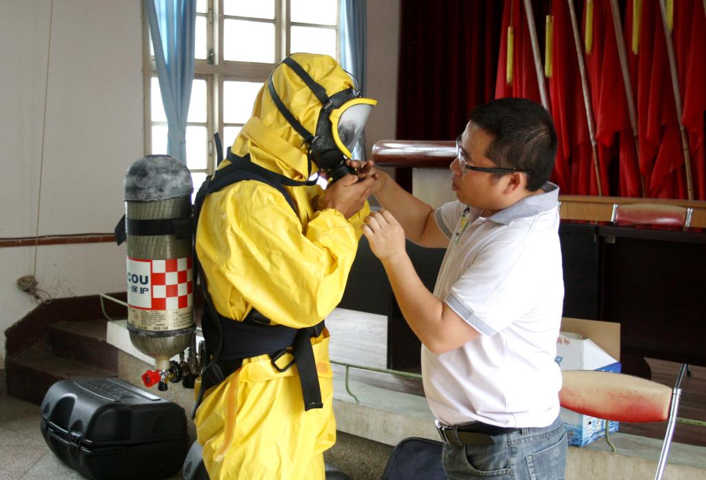 培训中,廖主任围绕防化服的使用及注意事项、穿戴方法,空气呼吸机的使用方法、佩戴姿势、穿戴步骤、检测方式、校验技术、定期检测和维护方式等一一作了说明和讲解。为提高人员实际操作能力,参培人员都进行了现场操作和使用。廖主任针及时更正大家在实际操作过程中出现的问题,强化了职工们印象。