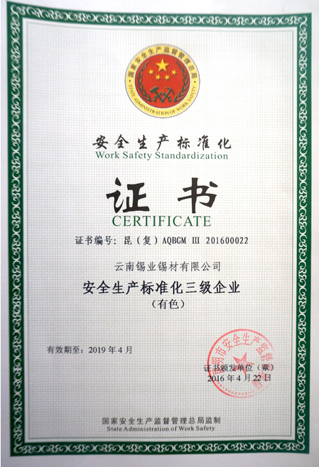 锡材公司2013年取得安全生产标准化三级达标企业称号,至今已满三年。2015年12月,锡材公司开展安全生产标准化换证复审工作,通过自评后上报经开区安监局。经昆明市安监局及经开区安监局组成专家评审组现场评审,锡材公司得分率达到安全生产标准化三级企业要求,顺利通过复审换证。