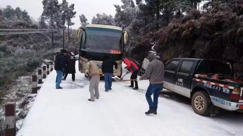 前一天,一场南方罕见的冰夹雪给大地披上了洁白的素装,凌晨三点,老厂开始下雪,由于气温过低,凡积水之处都结起了厚厚的冰,交通道路安全隐患较大。分矿值班领导和车队值班人员25日早上6点开始驾驶车辆巡视检查各路段情况,由于路面结冰对车辆安全行驶造成威胁,分矿决定接送职工上下班的通勤车暂时停开待命。