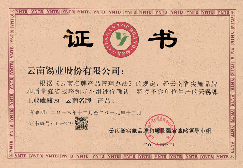 近日,锡业股份新申报的云锡牌工业硫酸、云锡牌银锭2个产品顺利通过云南省名牌战略推进委员会审核,被评为“云南名牌产品”。