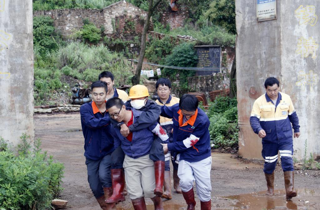 演练模拟2095平面望乡台因为连日降雨引发泥石流,现场管理人员立即报告坑口值班人员,值班人员电话报告矿应急指挥部。接到险情报告后,应急演练总指挥、副矿长林增洪立即启动应急处理机制,命令拉响灾情警报,组织救援人员火速前往事故现场进行处置,同时向上级部门报告。