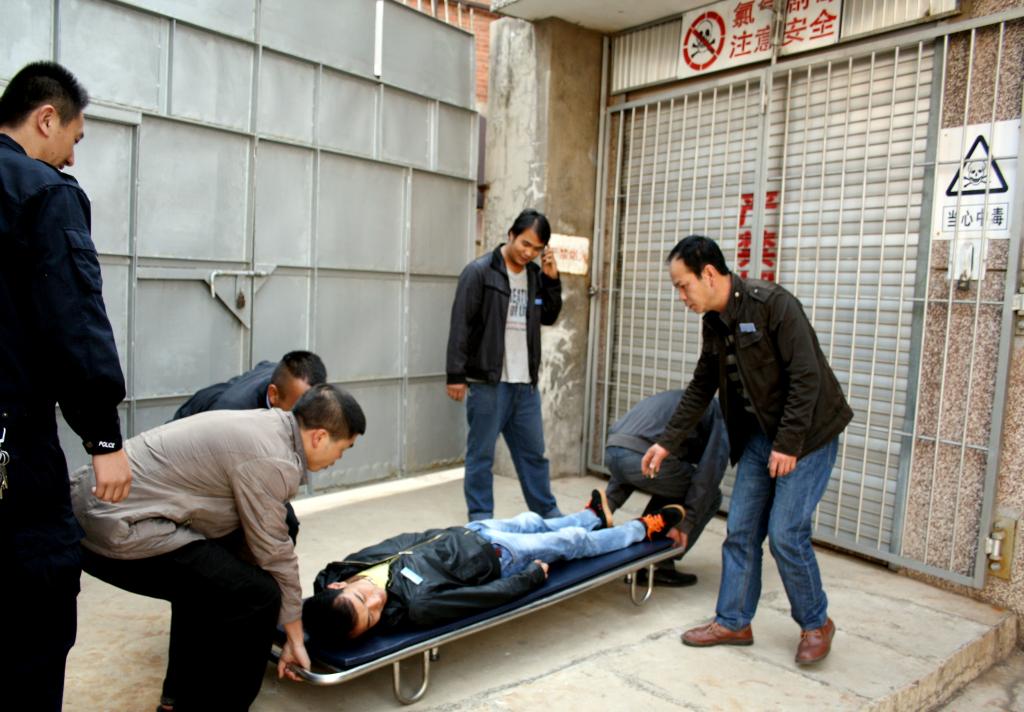 上午9:45分,供水公司应急处理办公室接到高处坠落事故报告,一名制水工在厂区净化站从高处坠落地面。指挥员立即启动应急救援措施,9:50分,人防专业队携带担架、急救药箱等器材进入演练现场,经查看,坠落人员无明显外伤,头脑较清醒,右耳有出血现象,疑似颅脑损伤。救援人员把伤员抬上担架抬到安全位置,抬时让伤员安静、保暖、平卧、少动、面部转向右侧,最后由模拟120急救车载伤者驶出演练现场,并到医院救治。演练结束后,演练人员立即进行总结,深入学习了《云锡供水公司突发性不稳定因素及恐怖突袭事件应急预案》。