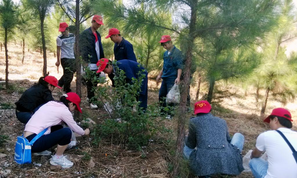 上午10点,志愿者们抵达山顶。放眼望去,2011年大家亲手种下的1500多棵小树苗如今已长成青翠俊俏的小树。山头上的小树林生机盎然,郁郁葱葱,曾经的荒山正在慢慢变成绿洲。为了保护这片成长中的绿洲,志愿者们立刻行动起来,用分发的工具将山上的塑料包装袋、烟蒂、纸屑等捡起放到垃圾袋中,集中清理环境。3个多小时后,大家共清理垃圾50余袋运往山下,每位志愿者都为营造绿色家园贡献了自己的一份力量。