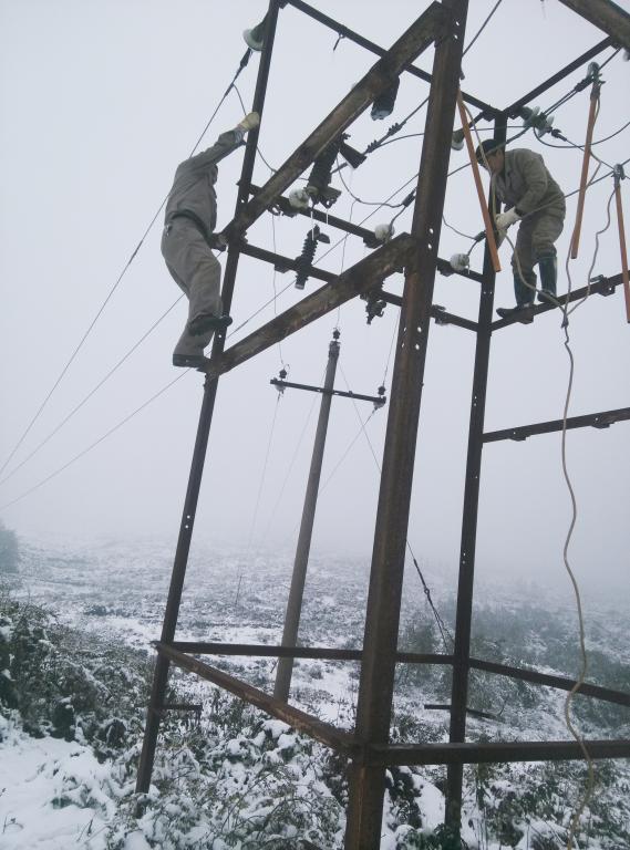由于不知跳闸原因,电工师傅们在确认站内设备完好的情况下,只有沿线对每一棵电杆进行仔细检查,雪太大,路面和山坡积雪较深,电工师傅们深一脚、浅一脚地艰难行走在崎岖的山路上,虽然雪花肆虐,手脚冻得麻木,但电工师傅们仍然坚持不停排查,在经过两个多小时的艰难排查后,终于查出,故障是因树木被大雪压断打在高压线路上造成线路中断出现短路引起停电。问题查出后,师傅们迅速在风雪中对线路进行抢修,由于风雪较大,电杆上已附上了一层厚厚冰雪,用脚扣和踩板上去十分困难,一不留神,就容易打滑跌落发生危险,但为了保证正常供电,师傅们仍然小心翼翼地爬上“冰杆”,有条不紊地把“受伤”的高压线连接起来,雪花不停地飘落到师傅们的身上,衣服渐渐被渗透,身体被冻得生痛,但参加抢修的电工师傅们仍然忘我地投入在抢修工作中。经过近8个小的抢修,终于于下午18:00抢修好受损线路,恢复正常供电。
