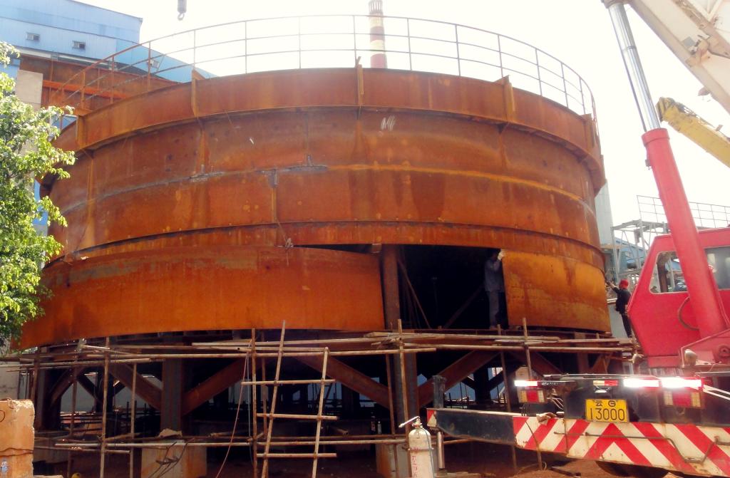 该浓密池壳体直径16米,重90余吨,是目前国内最大的全钢结构浓密设备。由于浓密池体积庞大,钢结构复杂,制作要求高,工期又紧,故安装任务非常繁重。