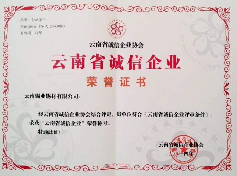 5月22日,锡材公司被云南省诚信企业协会授予“云南省诚信企业”称号。