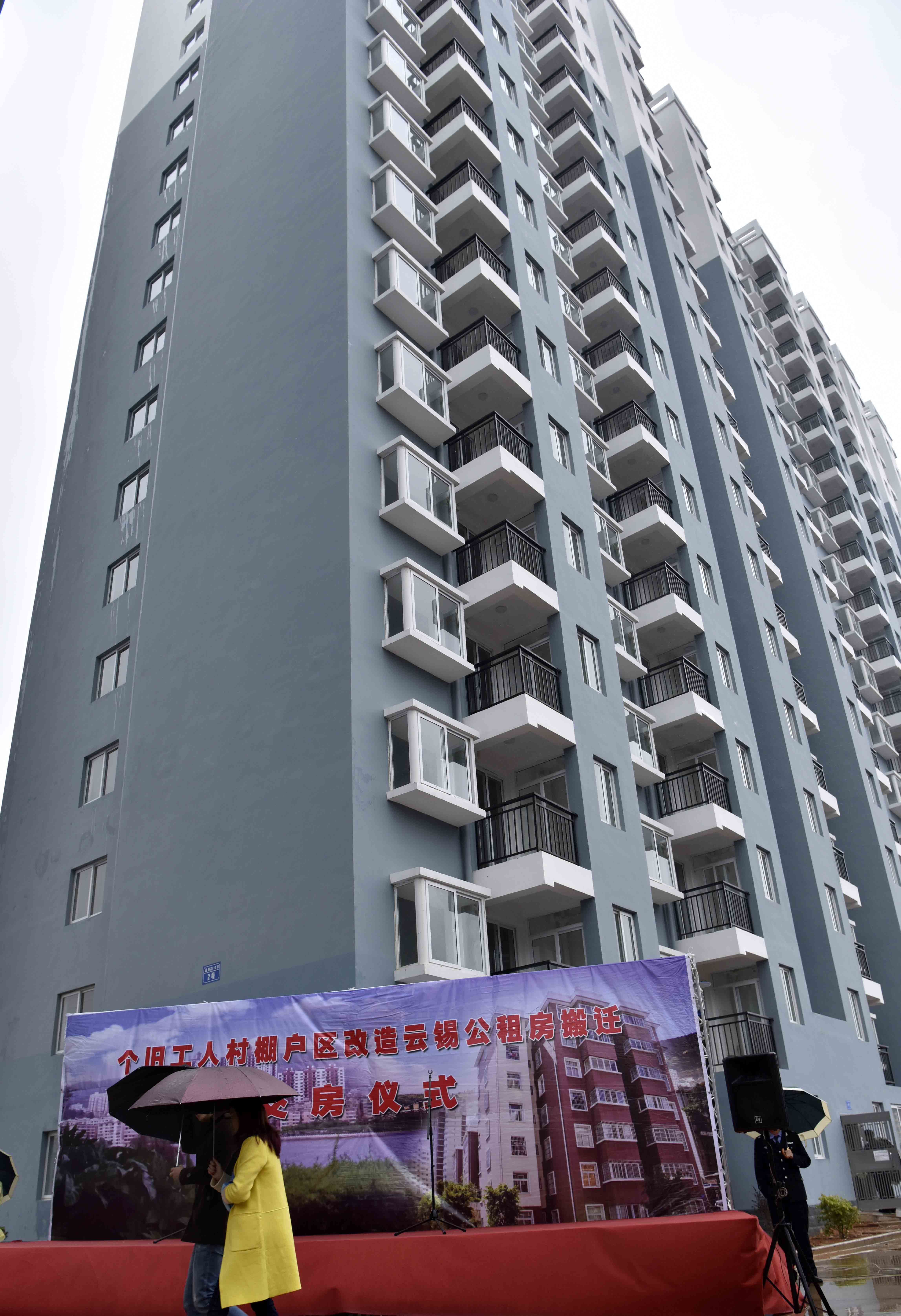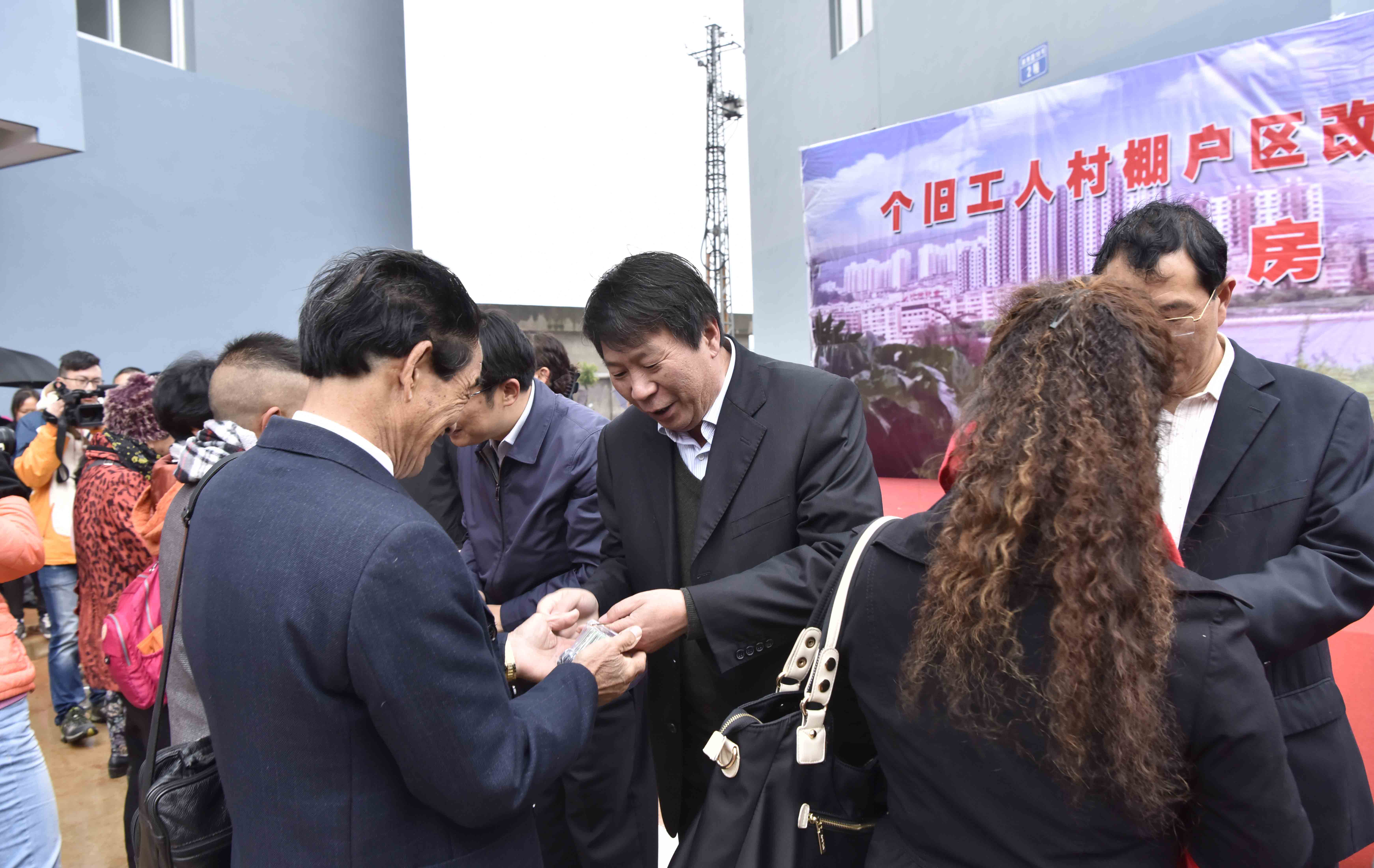 11月26日,个旧市工人村棚户区改造云锡公租房交房仪式在鄢棚南路69号公租房区进行。云锡控股公司党委书记、董事长张涛,党委副书记、副董事长、总经理李刚,省国资委派驻云锡监事会主席单治光,副总经理程睿涵、刘凡云,控股公司副董事长、锡业股份总经理杨奕敏,以及红河州委副书记、宣传部长盛高举,个旧市委书记罗萍、个旧市政府市长赵刚、副市长李开云为搬迁住户发放公租房钥匙。个旧市住建局和云锡控股公司有关部门和单位的负责人及部分搬迁户主出席仪式。