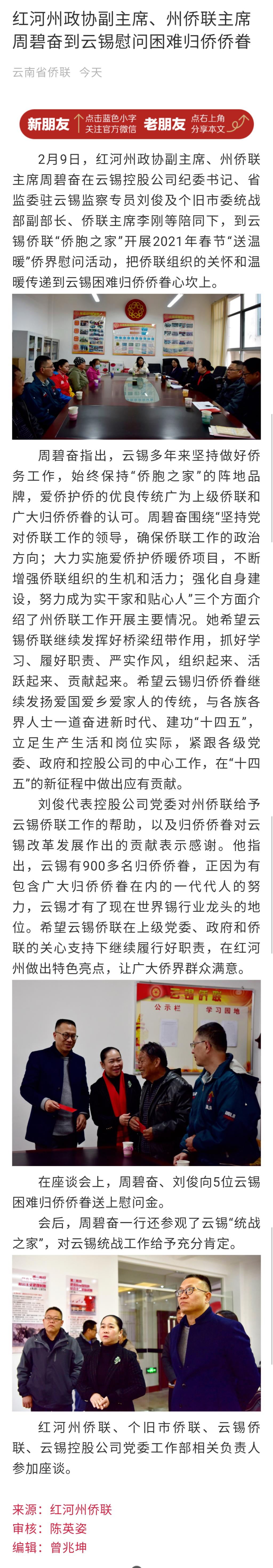 云南省侨联:红河州政协副主席、州侨联主席周碧奋到云锡慰问困难归侨侨眷