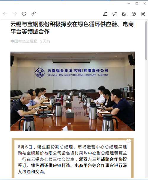 8月6日,锡业股份副总经理、市场运营中心总经理吴建勋与宝钢股份有限公司设备资材采购中心副总经理黄夏兰一行在云锡办公楼三楼会议室,就双方三年战略合作协议签订、绿色循环供应链打造、电商平台等合作事宜进行深入沟通和交流。