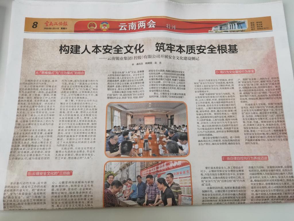 云南锡业集团(控股)有限责任公司为打造“国内一流,国际知名”的行业安全管理标杆企业创造安全、和谐、良好”的安全文化氛围,构建云锡百年安全文化知名品牌,公司结合百年积淀的厚重安全文化底瘟,以金川“五阶段”安全文化管控集成模式为蓝本,构建了云锡安全文化品牌。2017年12月,公司召开云锡安全文化建设的启动大会,标志着云锡安全文化建没正式开启,用文化管安全的理念正在形成。