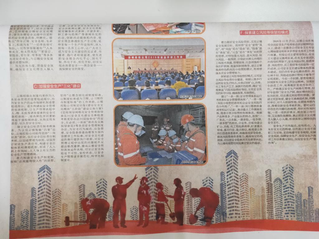 2019年11月27日,云锡公司在贯彻全国安全生产电视电话会议精神的会议上,就进一步推进公司安全文化专业化模块建设和年末岁首安全各项工作进行部署。控股公司主要领导指出,安全文化建设实施两年来,在有关专家团队的指导和帮助下,安全风险识别,隐患排查、风险管控、员工塑培等方面取得一定本建成。但仍存在专业化模块滞后形似神不似、风险动态辨识管控不够等不足和差距。今后一个时期,要贯彻落实好国家有关安全工作会议精神。加强安全防范工作,统筹做好其他方面的工作。严格落实安全生产网格化管理,织好专业部门安全生产网,做到横向到边,纵向到底,切实落实风险管控措施。要建立奖惩制度,健全完善激励机制,明确对单位、对个人阶段性地、长期地考核内容,探索创新安全考核机制。要对运行中存在的问题归类梳理,有针对性地纠偏,一项一项抓好落实,既注重正向引导,又实施负面激励,真正把安全文化理念入脑入心入魂,形成具有云锡特色的安全文化。