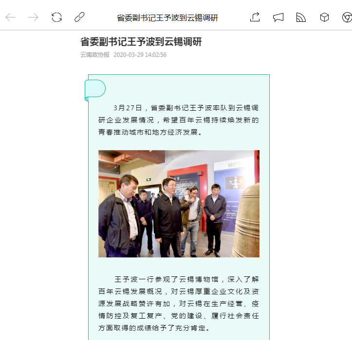 3月27日,省委副书记王予波率队到云锡调研企业发展情况,希望百年云锡持续焕发新的青春推动城市和地方经济发展。