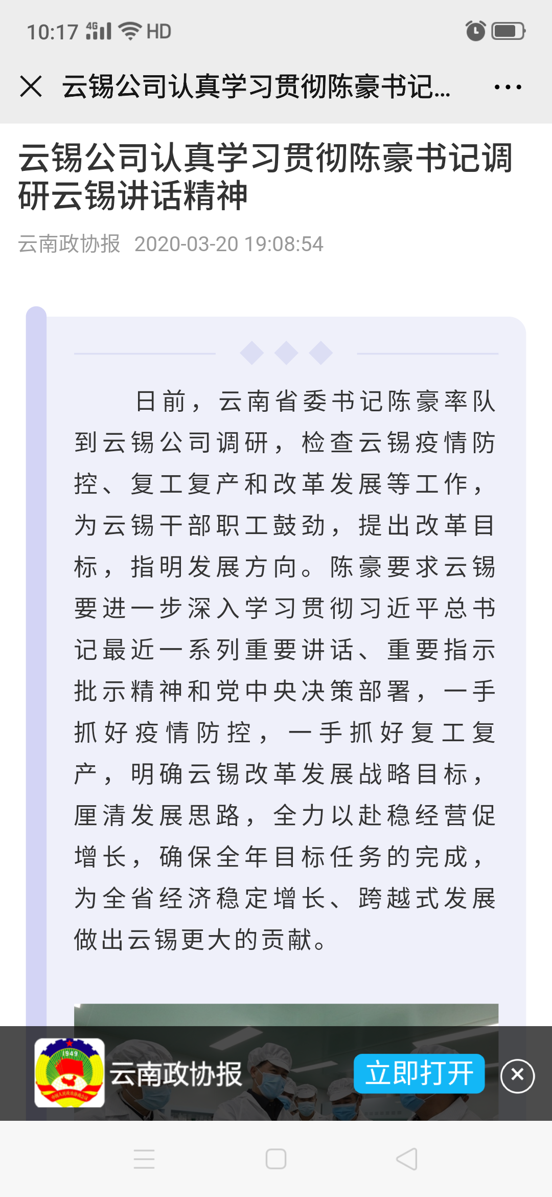 云锡公司党委书记、董事长张涛指出,陈豪书记此次到云锡调研,关心关注支持云锡改革发展,充分肯定了云锡在疫情防控、复工复产、深化改革等方面的工作和成效,是对为云锡广大干部职工的巨大鼓舞,陈豪书记对云锡未来发展提出了改革目标,指明了发展方向,对云锡当前和今后一个时期的改革发展具有十分重要的推动作用。
