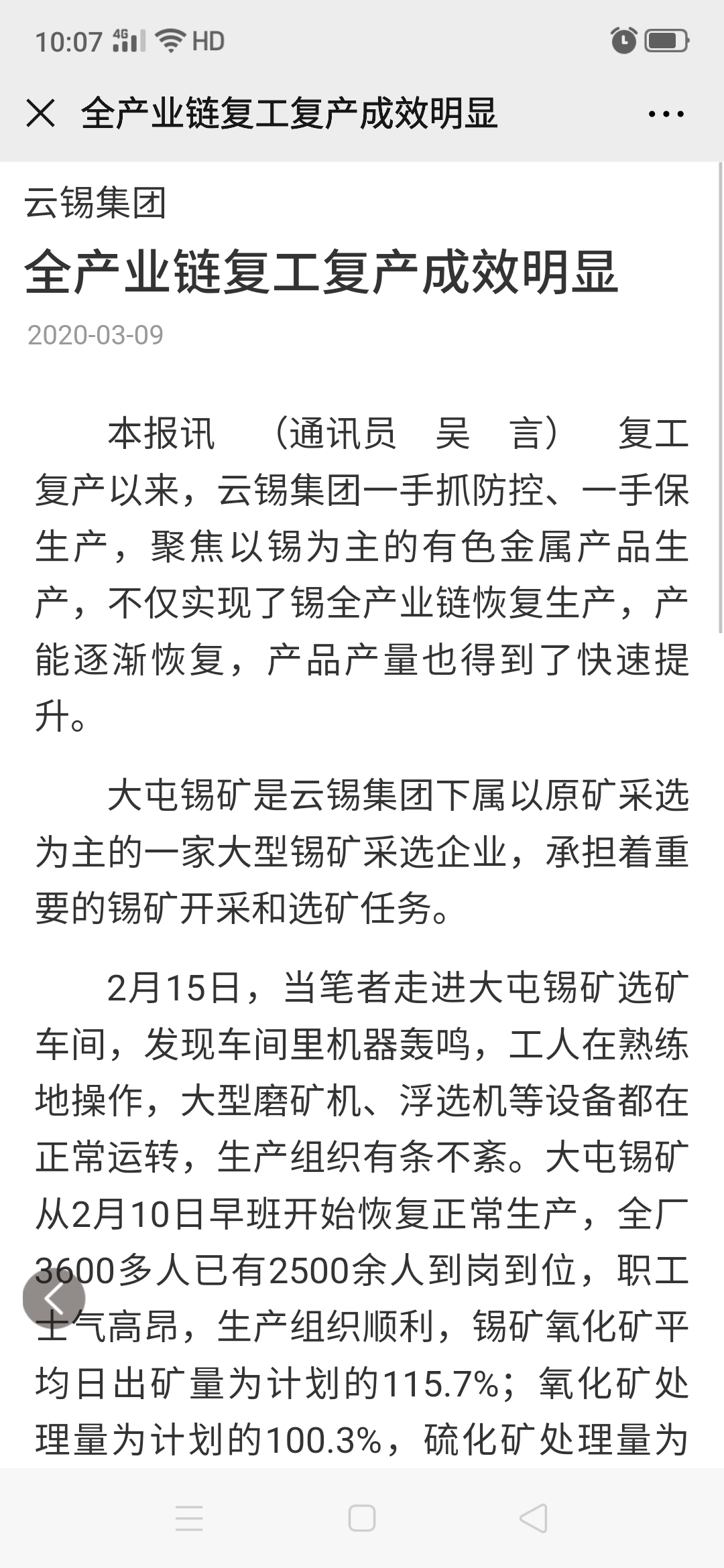 复工复产以来,云锡集团一手抓防控、一手保生产,聚焦以锡为主的有色金属产品生产,不仅实现了锡全产业链恢复生产,产能逐渐恢复,产品产量也得到了快速提升。