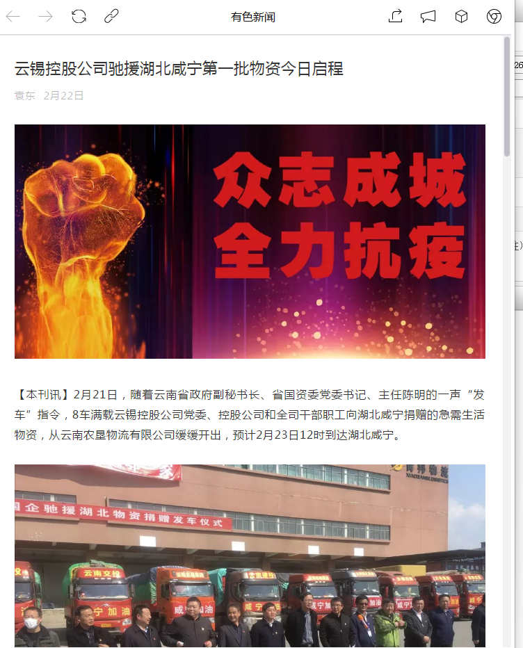 【本刊讯】2月21日,随着云南省政府副秘书长、省国资委党委书记、主任陈明的一声“发车”指令,8车满载云锡控股公司党委、控股公司和全司干部职工向湖北咸宁捐赠的急需生活物资,从云南农垦物流有限公司缓缓开出,预计2月23日12时到达湖北咸宁。