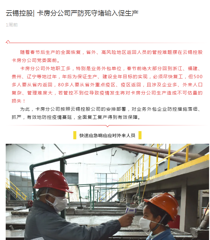 “卡房分公司复工复产后,多措并举抓好疫情防控工作,复工复产形势良好,复工率在90%以上,金竹林坑、冬瓜林坑铜、锡产量保持原有水平,基本没有受到疫情影响。“2020年一月份生产经营完成较好。”卡房分公司党委书记赛德辉说。
