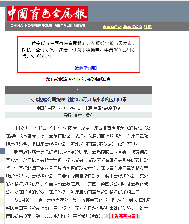 作为具有百年文化传承的国有企业,云锡控股公司不忘初心、牢记使命,面对重大疫情,坚决扛起企业的社会责任,展现国有企业的政治担当。按照省国资委党委切实做好疫情应急物资保障工作相关要求,接下来,云锡公司将继续发挥海外公司的渠道优势,积极从海外采购我省紧缺的医用物品和医疗物资,为坚决打好疫情防控阻击战尽到国有企业应尽的政治和社会责任。