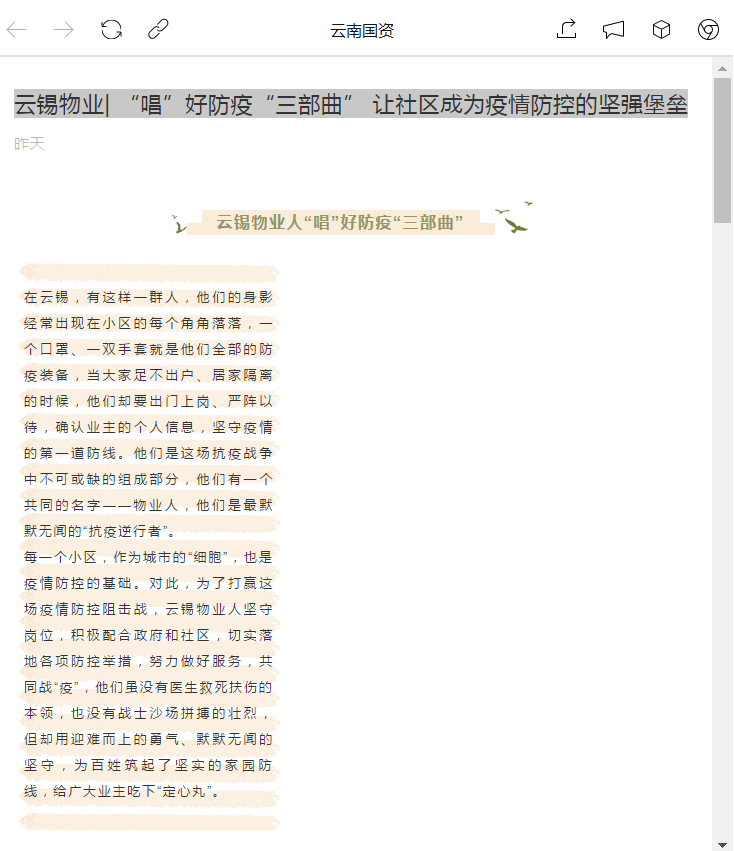 在“唱”好防疫“三部曲”的同时,云锡物业人也积极用好宣传阵地,呼吁住户高度重视疫情。各小区物业工作人员挂出横幅标语,并通过张贴温馨提示、倡议书以及微信公众号、业主微信群等线上“轰炸式”的信息告知,提醒住户 注意个人防护,科学做好疫情防控措施。