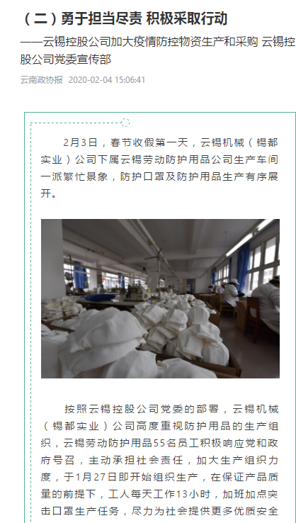 按照云锡控股公司党委的部署,云锡机械(锡都实业)公司高度重视防护用品的生产组织,云锡劳动防护用品55名员工积极响应党和政府号召,主动承担社会责任,加大生产组织力度,于1月27日即开始组织生产,在保证产品质量的前提下,工人每天工作13小时,加班加点突击口罩生产任务,尽力为社会提供更多优质安全的防疫产品。2月3日当天,完成生产KN95口罩4000只。