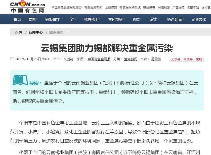 云锡集团作为国有特大型企业集团,承担起国有企业的社会责任。与个旧市委、市政府,加强沟通协作,有效推进重金属污染综合防治工作。