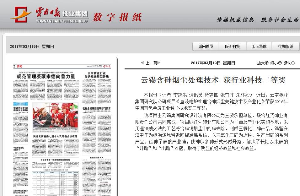 本报讯(记者 李继洪 通讯员 杨建国 张有才 朱林毅) 近日,云南锡业集团研究院科研项目《直流电炉处理含砷烟尘关键技术及产业化》荣获2016年中国有色金属工业科学技术奖二等奖。