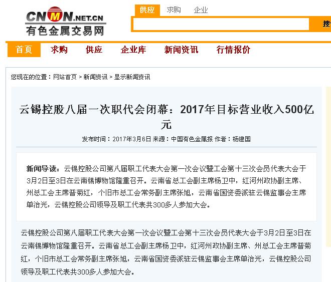 云锡控股公司总经理李刚代表控股公司作题为《奋战2017为云锡实现扭亏为盈而努力拼搏》的行政工作报告,2017年的主要目标是营业收入:500亿元。奋斗目标是实现扭亏为盈。在云锡控股公司实现扭亏为盈且各单位完成预算目标的情况下,在岗职工人均收入增长8%。2017年主要任务是强推改革,实现扭亏,加速转型。围绕主要目标和任务,2017年要抓好以下四个方面的工作:一、强势推进改革攻坚,务求取得新突破。二、全力以赴攻坚决战,务必实现扭亏为盈。三、突出重点加速转型升级,务求取得新成效。四、持续抓好和谐企业建设,为改革、扭亏、转型营造良好的发展环境。