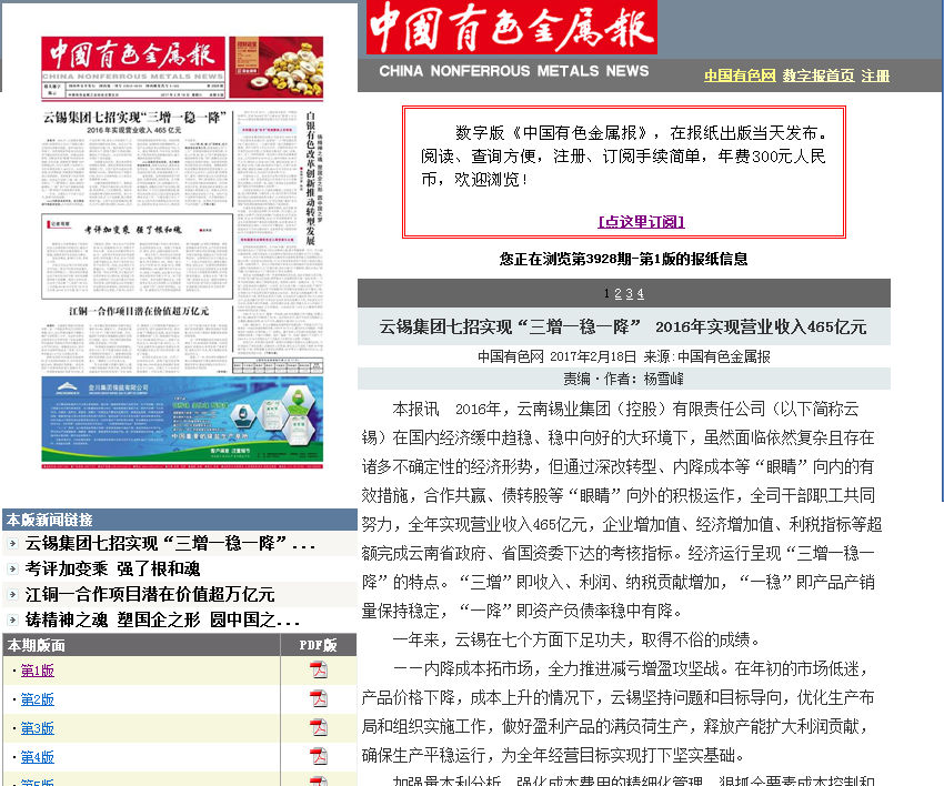 本报讯 2016年,云南锡业集团(控股)有限责任公司(以下简称云锡)在国内经济缓中趋稳、稳中向好的大环境下,虽然面临依然复杂且存在诸多不确定性的经济形势,但通过深改转型、内降成本等“眼睛”向内的有效措施,合作共赢、债转股等“眼睛”向外的积极运作,全司干部职工共同努力,全年实现营业收入465亿元,企业增加值、经济增加值、利税指标等超额完成云南省政府、省国资委下达的考核指标。经济运行呈现“三增一稳一降”的特点。“三增”即收入、利润、纳税贡献增加,“一稳”即产品产销量保持稳定,“一降”即资产负债率稳中有降。 一年来,云锡在七个方面下足功夫,取得不俗的成绩。 ——内降成本拓市场,全力推进减亏增盈攻坚战。在年初的市场低迷,产品价格下降,成本上升的情况下,云锡坚持问题和目标导向,优化生产布局和组织实施工作,做好盈利产品的满负荷生产,释放产能扩大利润贡献,确保生产平稳运行,为全年经营目标实现打下坚实基础。 加强量本利分析,强化成本费用的精细化管理,狠抓全要素成本控制和降低工作,主营产品作业成本比预算降低14.15%。围绕劳动生产率提升目标,优化人力资源结构,人工成本比预算降低4.44%。 在融资极度困难情况下,置换高息负债,严格对外接待和公务用车管理,财务费用、三公经费降低。紧抓有色金属价格反弹的有利时机,加大市场拓展力度,扩大产品销量,最大限度释放产能,主营产品内贸销量同比增长9.17%,销价同比增长24.66%。充分利用套期保值等多种手段,防控价格波动风险。加强原料采购策略研究,主营产品采购价差比预算创效7710万元。通过内降成本、外拓市场、挖潜创效、严格考核等攻坚措施的落实,减亏增盈攻坚战收效明显。 ——多措并举出实招,全力确保资金链安全。清理沉淀资金,提高资金使用效率。加大债权清收和存货占用资金的压缩力度,资金流转速度上升。 盘清家底,加快闲置低效资产的盘活、处置和变现,回收资金。扎实做好传统间接融资工作,创新融资方式,新增融资。调整优化资产资本结构,降低负债率。千方百计抢抓政策机遇,顺利完成首批22亿元国企深改基金转增资本金工作。与建设银行签订了100亿元的市场化债转股系列合作协议,首批到位资金22.5亿元,降低资产负债率。 ——“调、转、破、立”四维度,全力推进深化改革工作。紧紧围绕公司“十三五”发展规划确定的发展思路、目标,从“调、转、破、立”四个维度推进实施深改转型方案。“调”:调整优化总部功能定位和组织架构,加快投资控股型总部顶层设计的落地。调整扭转传统过度集权揽事的经营管控模式,以6家试点企业先行,全面实施“松绑放权”,激发二级单位独立自主经营的活力和动力。“转”:转变观念,总结云锡多元化投资失败的深刻教训,切实转变盲目扩张、冒进投资的发展观念,将发展重心聚焦锡主业,将锡主业的发展动力锁定在深加工产业。加快产品产业转型升级步伐,召开锡材锡化工改革发展大会,依靠技术进步加快新产品市场推广,推动云锡产品产业从产业链低端向高技术含量、高附加值转型升级。“破”:打破同类业务管理分散和低效的局面,围绕集约化协同发展的目标,实施了锡业股份个旧东部矿山采选一体化改革,完成了广元公司与大酒店的整合。破冰产销脱节的痼疾,按产购销一体化格局,推进营销体系改革。突破体制机制的束缚,加大三项制度改革力度,大力推进控股公司总部新一轮的“三定”和薪酬考核体系改革。“立”:围绕控股公司产业培育目标,改制成立了物流公司、研究院公司和前海融资租赁公司并有序开展业务,为云锡贸易金融业务和科技服务产业打下了良好基础。 ——责任担当勇作为,全力化解风险和处置历史遗留问题。群策群力,艰苦博弈,据理力争,积极推进房地产项目风险化解工作。西房项目“退二进一”,天晋项目学区房去库存。石林项目、云锡同乐、煤机厂、元江镍业公司、建水两个公司问题的解决在曲折中积极推进。 ——创新驱动,重点突破,全力培育转型升级发展新动力。积极打造云锡新材料产业,打造 “两中心、三基地”,即世界级锡基新材料研发中心、省级的铟系列材料研发中心、世界最大的锡基新材料产业基地、世界最大的锡化工产业基地、云南铟系列新材料产业基地。通过与国际锡协、美国铟公司的广泛、深入合作加快推进各项工作。 ——超前谋划抢先机,全力抢抓政策争取机遇。云锡成功抓住国家实施降低企业杠杆率政策机遇,成为全国首家地方国企市场化债转股项目试点企业,对改善云锡融资环境具有重要的现实意义,对云锡树立良好的社会形象起到重要的示范效应。积极争取云南省国企深改基金,云锡成为云南省首批国企深改基金的受益企业。 率先实施省内市场化直购电及电力市场化竞价交易,全年降低用电成本1.5亿元。各部门、单位紧抓国家和各级地方政府稳增长系列政策机遇,全年预计争取政策资金对公司减亏增盈起到较好支撑作用。加大与商务部、工信部等国家部委的沟通对接,积极争取锡、铜精矿进料加工贸易政策。“瘦身健体”,扎实做好“三供一业”“僵尸企业”处置等国有企业剥离办社会职能和历史遗留问题解决政策的争取,为云锡转型发展夯实基础。 ——强化措施夯基础,全力巩固提升安全环保工作水平。认