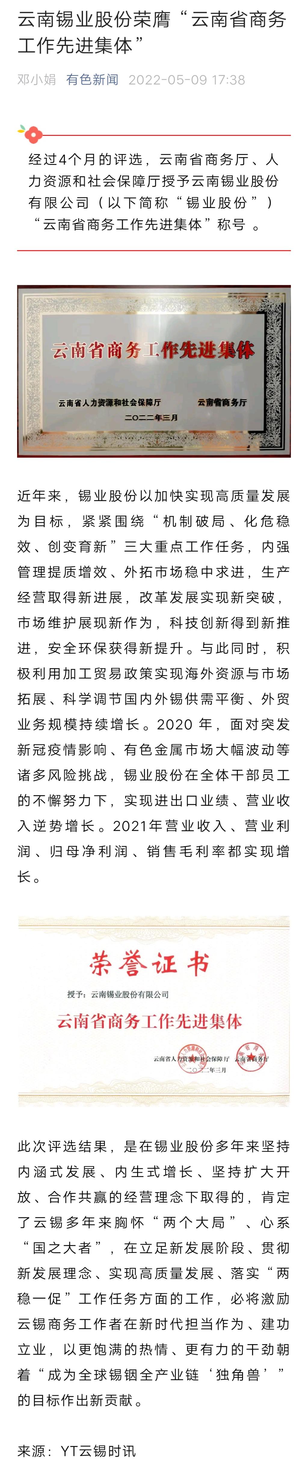 有色新闻:云南锡业股份荣膺“云南省商务工作先进集体”