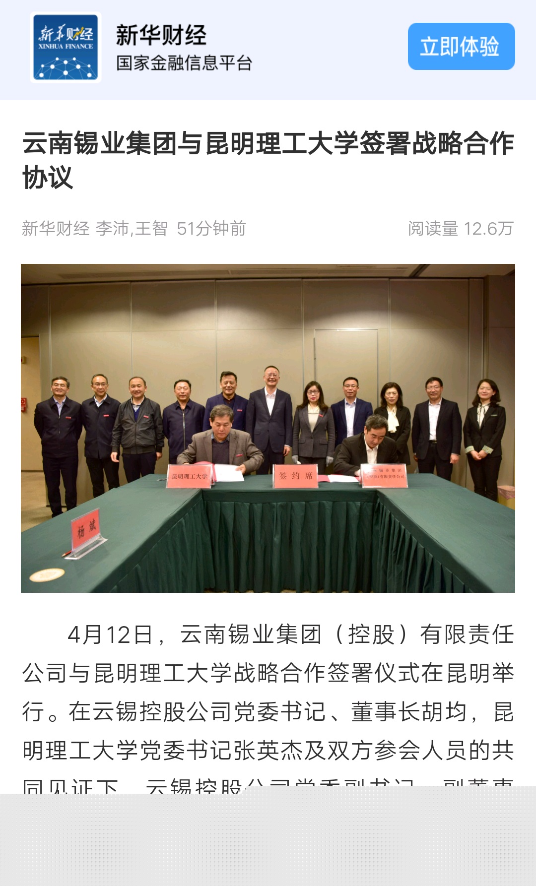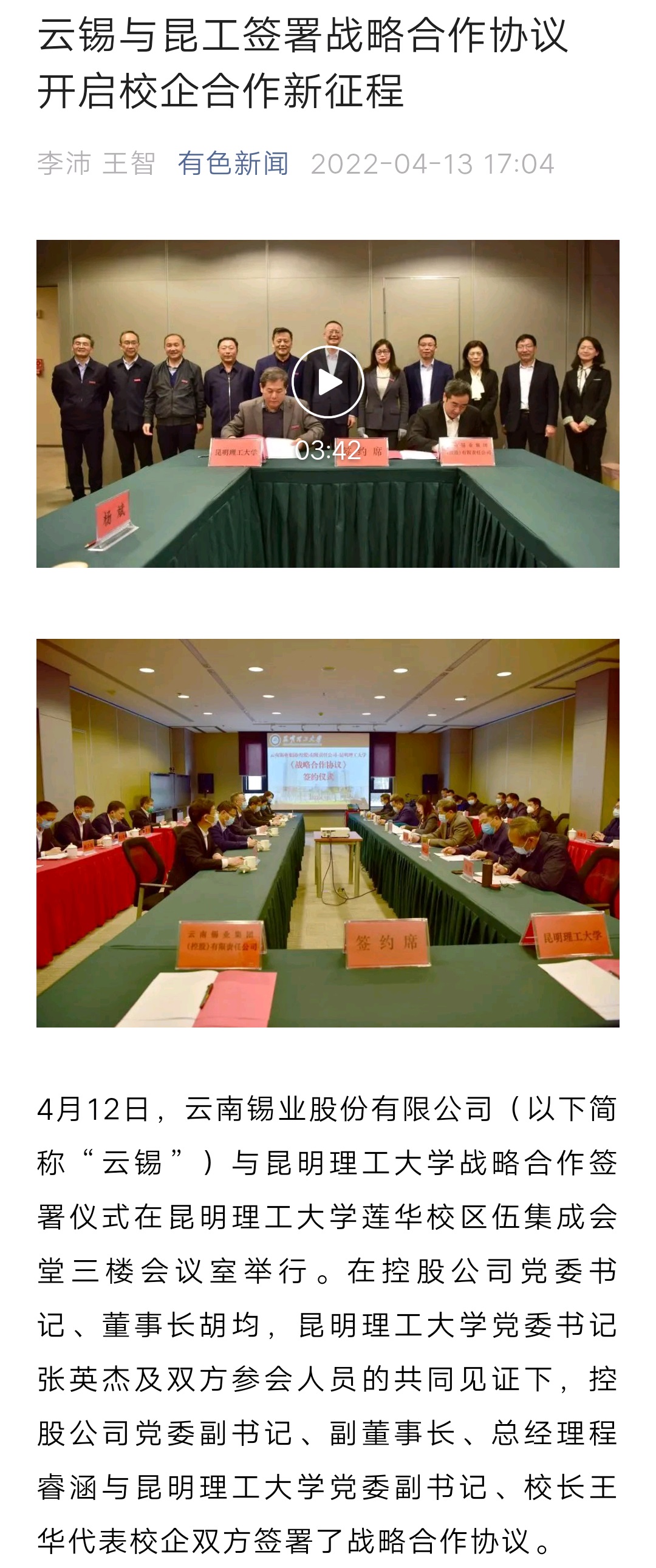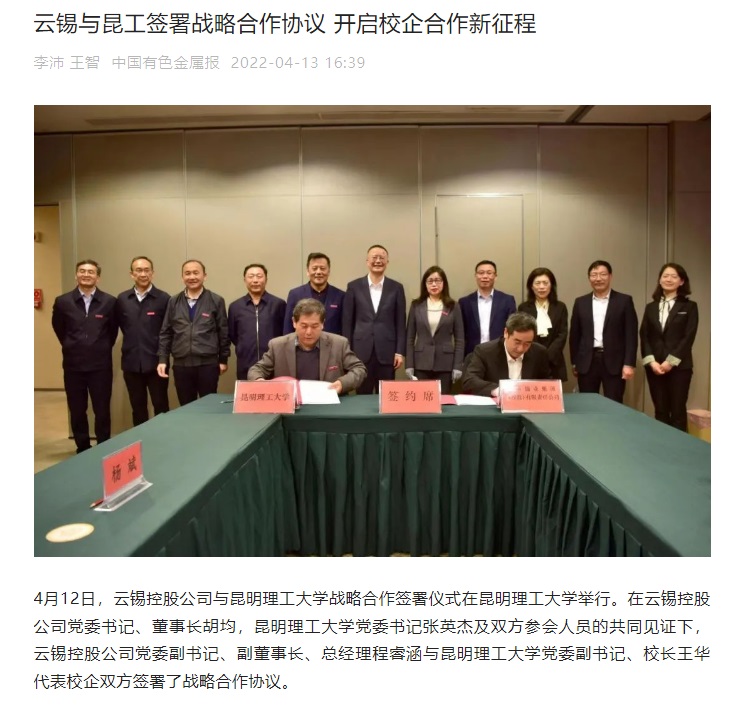 新华财经、云南新闻联播、云视新闻、云报客户端、云南国资、中国有色金属报、有色新闻:云锡与昆工签署战略合作协议